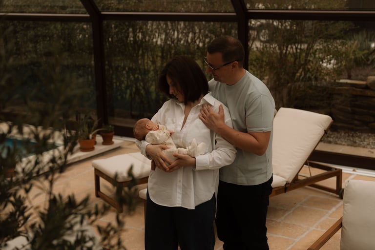 Der Fotogutschein wird zum Familienereignis: Eltern und Baby erleben gemeinsam einen entspannten Tag, der in warmen, liebevollen Bildern festgehalten wird.